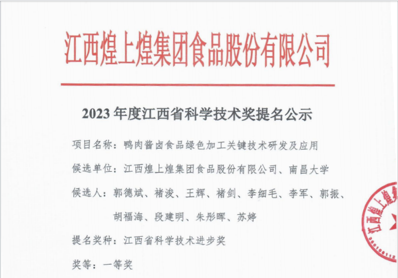 關于江西煌上煌集團食品股份有限公司申報2023年度江西省科學技術獎提名公示依據《關于2023年度江西省科學技術獎提名工作的通知》(贛科發成...