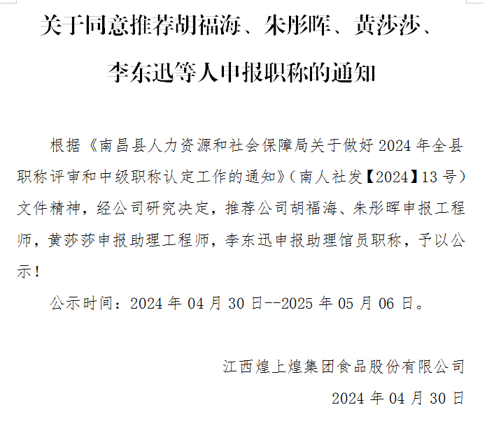 根據《南昌縣人力資源和社會保障局關于做好2024年全縣職稱評審和中級職稱認定工作的通知》(南人社發【2024】13號)文件精神,經公司研究決...