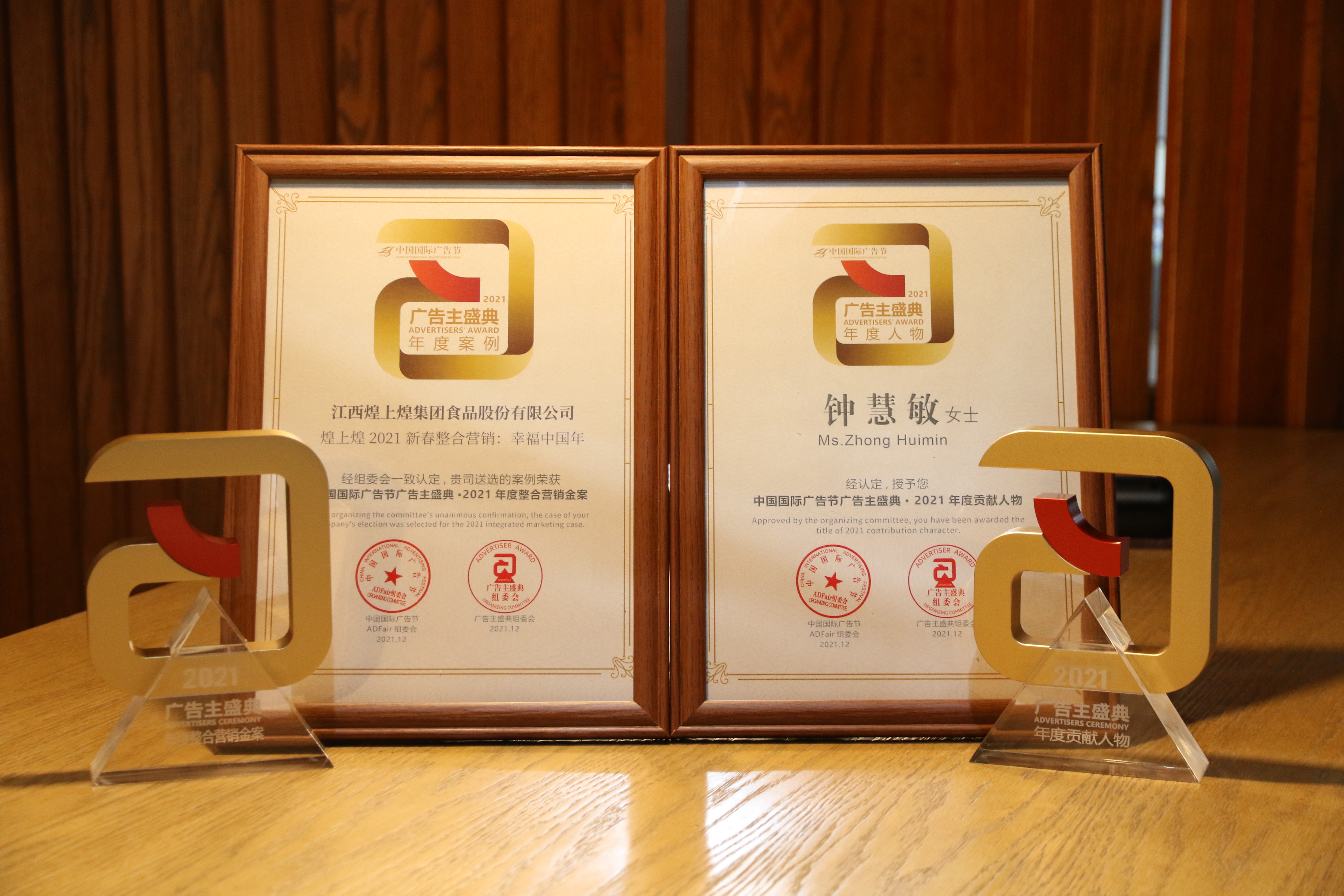 在如此激烈角逐之下,煌上煌《2021新春互動營銷:幸福中國年》 憑借消費(fèi)者探知、體驗(yàn)與互動、多渠道整合等方面的突出表現(xiàn),最終斬獲“2021年度整合營銷金案”獎?;蜕匣托旅襟w經(jīng)理鐘慧敏女士同時被組委會認(rèn)定并頒發(fā)“中國國際廣告節(jié)廣告主獎·2021年度貢獻(xiàn)人物”獎。