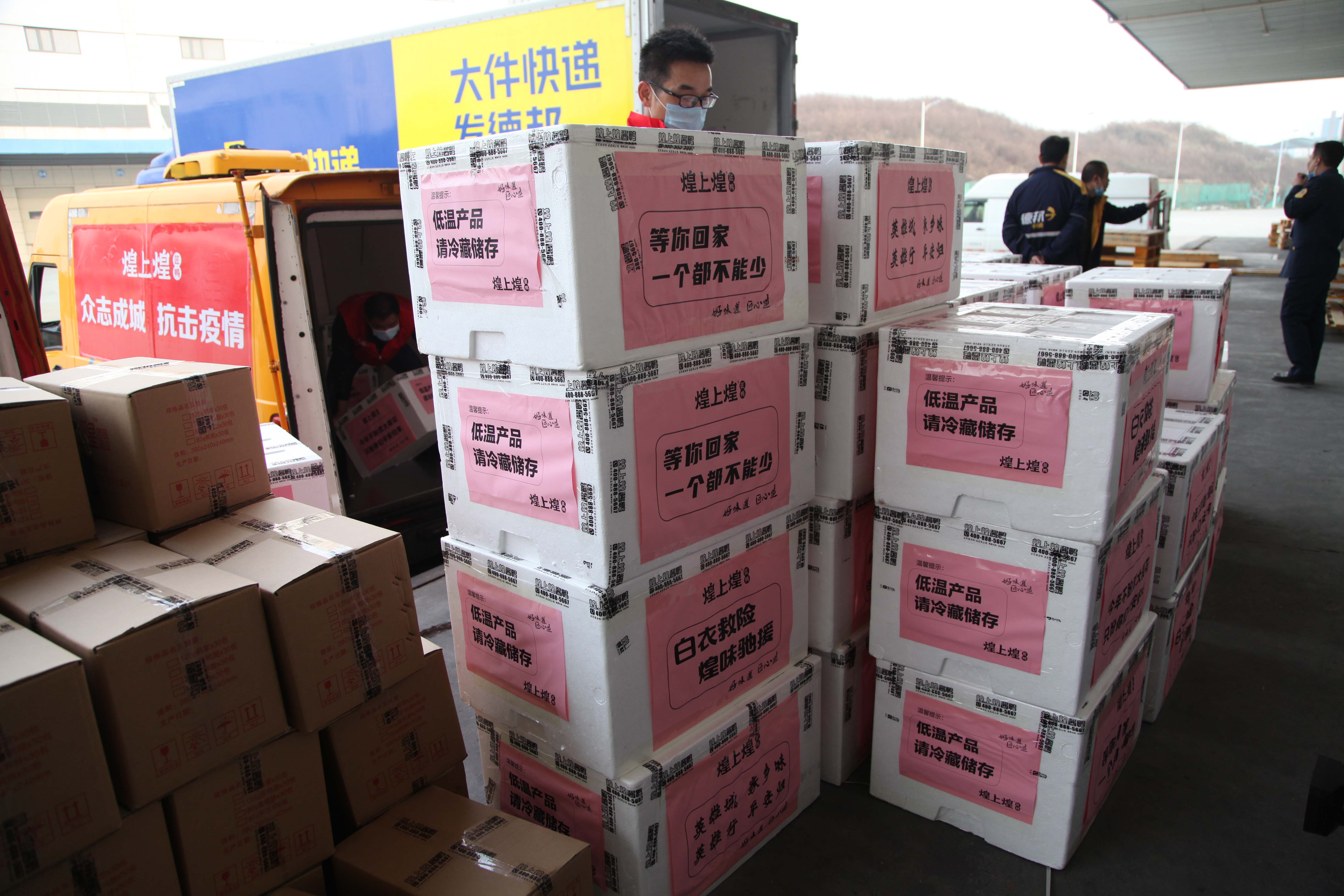 白衣天使吃到家鄉味道時露出的一張張笑臉,也被煌上煌記在了心里。隨后不久,煌上煌籌備了2000份樂鮮裝產品禮盒,附帶著煌上煌人親手寫下的祝福便簽,專車運往湖北隨州,送至一線醫療隊員手中。之后,又與江西郵政攜手,馬不停蹄將第二批產品和物資送往武漢。